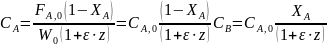 Если объем или объемный поток остаются постоянными во времени реакции, то в ранее выведенных формулах для расчета материального баланса и для расчета безразмерных характеристик реакций вместо ni (Fi) можно подставлять Сi. Это типично для жидкофазных процессов, а для газофазных встречается в тех случаях, когда реакция протекает при постоянном общем давлении и температуре без изменения числа молей веществ или без промежуточного разбавления смеси.