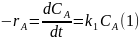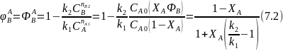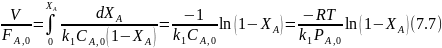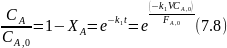 Уравнение (7.8) соответствует постепенному расходованию исходного реагента А, линейно зависящему от степени конверсии, и экспоненциально ‒ от t или V/FA,0 . При этом все точки укладываются на одну кривую, когда по оси абсцисс откладывают k1t или (k1VCA,0)/FA,0.
