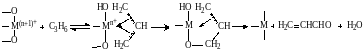 Олефины дают с переходными металлами и их ионами прежде всего π‒комплексы со смещением электронов от олефина к металлу, как это установлено для металлокомплексного катализа. Кроме того, в гетерогенном катализе нередко принимают менее вероятное образование последующих аддуктов, которые в следующей схеме взяты в скобки:
