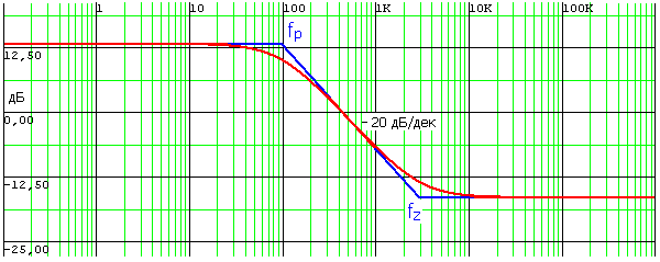 Для наглядности на рис. 42, а построены асимптотические АЧХ для нуля и для полюса отдельно. Начиная с частоты нуля fz коэффициент передачи увеличивается с наклоном +6 дБ/окт. После частоты полюса fp действуют две асимптоты: одна с наклоном +6 дБ/окт., а другая – с наклоном –6 дБ/окт. и компенсирует влияние первой. В результате (рис. 42, б) общая АЧХ имеет три асимптоты: до fZ – горизонтальная асимптота, затем в интервале частот fz...fp асимптота имеет наклон +6 дБ/окт., далее – снова горизонтальная асимптота.