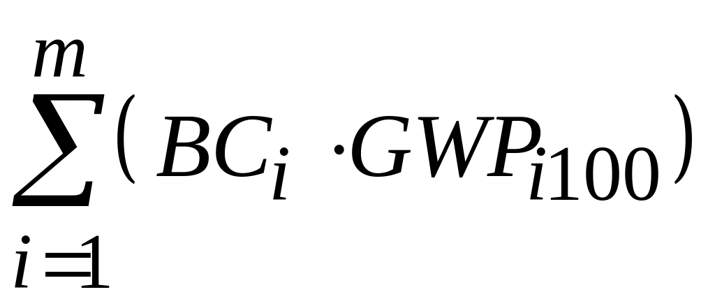 Cjb мг/м3, CjAAU мг/м3, BCj мг/м3, GWPj100 – начальная, предельно допустимая по углеродным квотам, фоновая (background concentration BC) концентрации и потенциал глобального потепления j-го вида выбрасываемых парниковых газов;