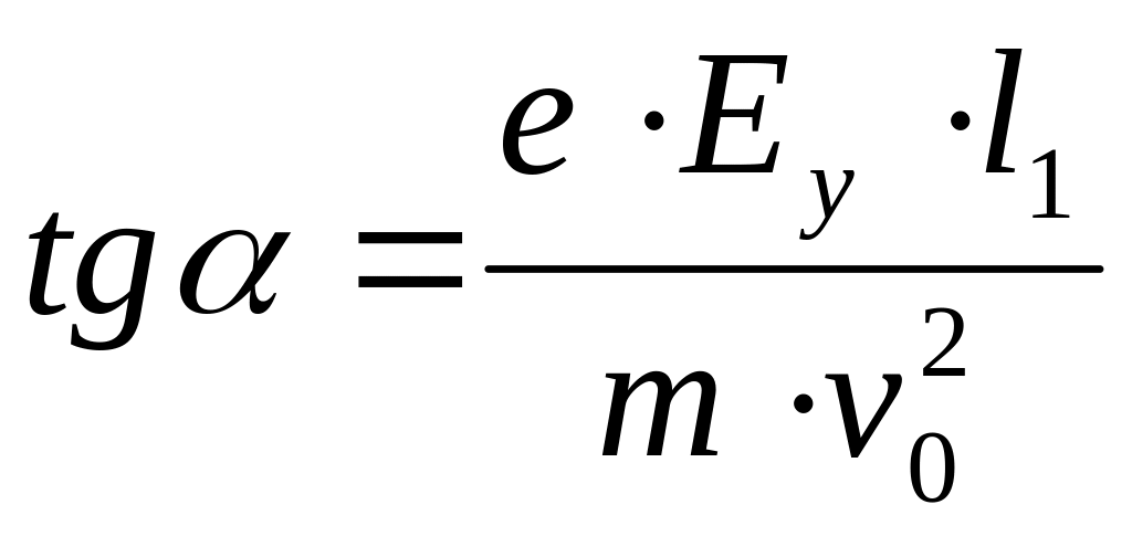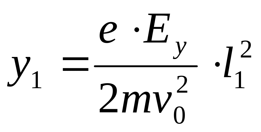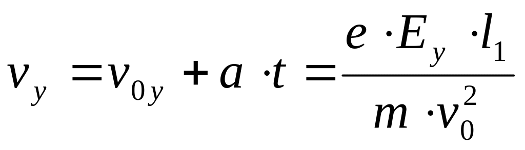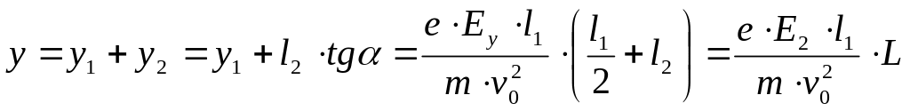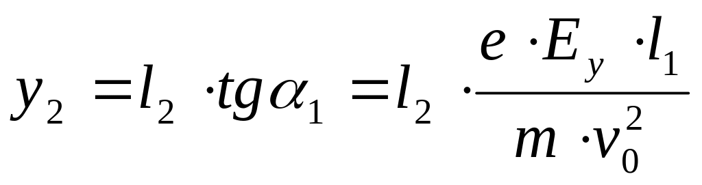 Найдем полное отклонение электронного луча на экране осциллографа. Пусть расстояние от отклоняющих пластин до экрана l2 . Тогда после выхода за пределы пластин к экрану электрон движется прямолинейно и получает дополнительное смещение на экране у2.