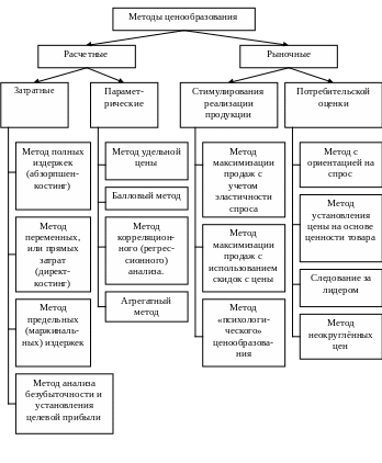 Совокупность различных методов ценообразования представляет собой определенную систему. Все методы ценообразования можно условно разбить на две группы. К первой группе относятся расчетные методы ценообразования. Ко второй группе - рыночные методы (рис. 4.4). Приведённая на рис. 4.4. схема может немного различаться в разных источниках, а также не является полной – существуют и другие методы ценообразования.