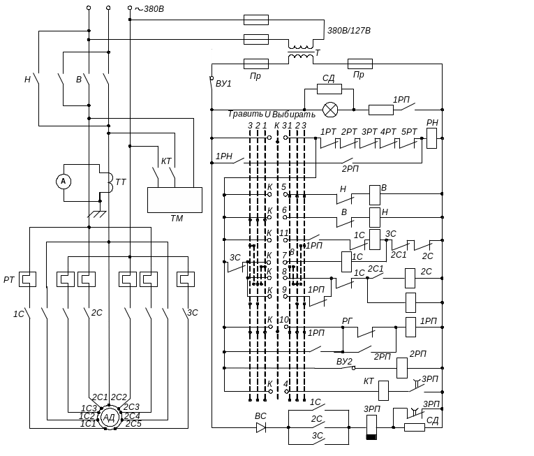 Рисунок 2.5 - Командоконтроллерная схема управления брашпилем на переменном токе
