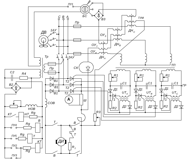 БС через В3, тороидный трехфазный магнитный усилитель ТУМ и трансформатор питания ТП управляет работой релаксационными генераторами ГР (ГР – это генераторы периодического напряжения несинусоидальной формы, в которых происходит периодически повторяющееся накопление энергии в реактивных элементах с последующим расходованием в активных резисторах).