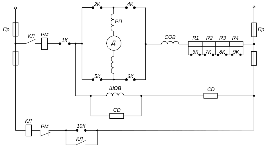 Во втором положении дополнительно замыкает 6К, в 3 – 7К, в 4 – 8К и в 5 – 9К постепенно отключая сопротивления R1, R2, R3, R4 и двигатель выходит на естественную характеристику.