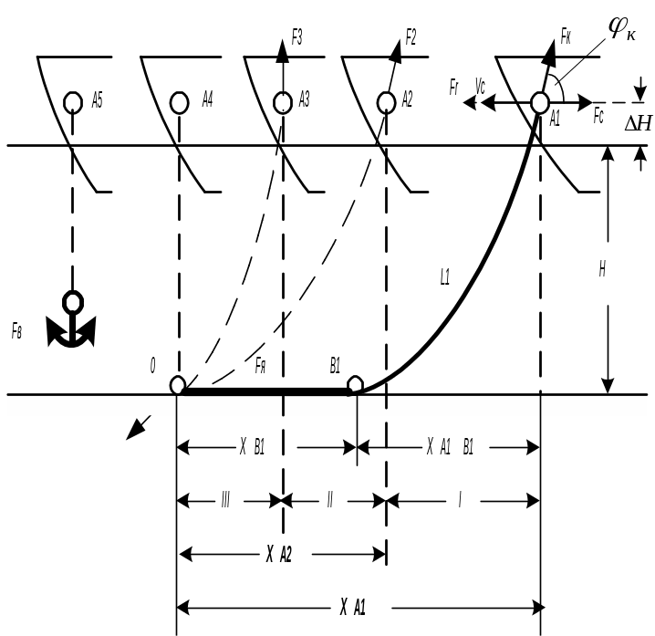 Привод должен обеспечивать выбирание цепи с указанной скоростью и тяговым усилием в течение не менее 30 мин без перерыва, а также спуск одного якоря на глубину якорной стоянки. Рекомендуемая скорость втягивания якоря в клюз не более 7м/мин. Кроме того, привод должен обеспечить одновременное выбирание двух свободно висящих якорей с половины условной глубины, определяемой диаметром якорной цепи: