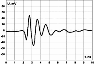 Рис.1.13. Пример видеоимпульсаОднако следует отметить, что некоторые типы антенн, используемые для излучения СШП сигналов, являются «потомками» традиционных, узкополосных антенн и не всегда обладают достаточной широкополосностью. Поэтому при ударном возбуждении коротким видеоимпульсом такие антенны излучают радиоимпульс, длительность которого τизл превышает, и иногда значительно, длительность импульса формирователя τформ, возбуждающего антенну (пример такого импульса показан на рис. 1.14). Длительность и частота заполнения этого радиоимпульса определяется конструкцией антенны и параметрами возбуждающего ее видеоимпульса. Очевидно, что разрешающая способность РЛС по дальности в этом случае будет определяться длительностью излученного радиоимпульса τизл (или шириной его амплитудно-частотного спектра), а не длительностью видеоимпульса, возбуждающего антенну.