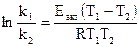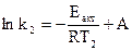 Энергию активации можно также оценить, если известны константы скорости при двух температурах Т1и Т2. Тогда для каждой температуры можно записать lnk1 = lnk0 – Е0 ⁄RT1 lnk2= lnk0 – Е0 ⁄RT2 вычитая из второго уравнения первое, получают: lnk2 – lnk1 = (lnk0 – Е0 ⁄RT2) – (lnk0 – Е0 ⁄RT1) отсюда: ln(k2 ⁄k1)= Еа (Т2–T1) ⁄RТ2Т1 выражение для энергии активации имеет вид: Еа = RТ2Т1 ln(k2 ⁄k1) ⁄(Т2–T1) где Еа - Дж ⁄ моль