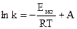 Энергию активации (энтальпию активации) можно вычислить по значениям константы скорости, измеренным при нескольких разных температурах. По экспериментальным данным строят график зависимости lnk от1 ⁄T тангенс угла наклона полученной прямой линии к оси Х равен (-Еа ⁄R) стр 257