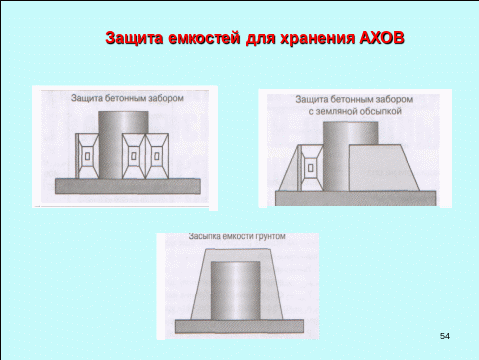 Так защита емкостей для хранения АХОВ от разрушения взрывами и другими воздействиями путем ограждения бетонным забором, земляным валом и заглублением в грунт (рис. 2.2).