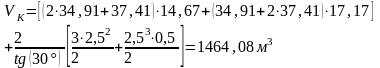 где Н = 2,5 - глубина котлована, м; b = 3 - ширина въездной траншеи по дну, м; т'в, т - коэффициенты заложения откосов, соответственно, дна траншеи и котлована.
