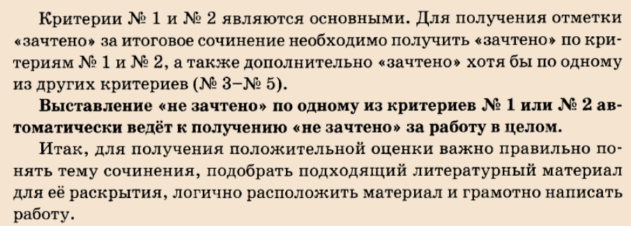Для получения «зачета» за итоговое сочинение необходимо получить «зачет» по критериям № 1 и № 2 (выставление «незачета» по одному из этих критериев автоматически ведет к «незачету» за работу в целом), а также дополнительно «зачет» по одному из других критериев.
