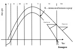 З цієї позиції головною причиною неплатоспроможності підприємства може бути зниження або недостатнє зростання виручки. Зростання виручки може бути зумовлене як збільшенням витрат виробництва й одночасним скороченням частки прибутку, так і збільшенням питомої ваги прибутку в складі виручки разом зі зниженням витрат. При цьому в першому випадку, незважаючи на сприятливу динаміку обсягу реалізації, спостерігається реальне скорочення можливості розширеного відтворення, яке супроводжується, у свою чергу, зменшенням майбутнього обсягу виручки. Отже, динаміка зміни прибутку здатна своєчасно відобразити фазу життєвого циклу виробничо-господарської системи. У зв’язку з цим доцільно використовувати його як практичний інструмент антикризового управління. Життєвий цикл промислового підприємства, побудований з орієнтацією на обраний показник, поданий на рис.1.1.1.