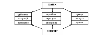 Наступний підхід до розкриття суті понять „продукт”, „послуга” і „операція” також заснований на встановленні ієрархії між цими поняттями. Банківський продукт – спосіб надання послуг клієнтові банку; регламент взаємодії службовців банку з клієнтом за умови надання послуги, тобто комплекс взаємозв'язаних організаційних, інформаційних, фінансових і юридичних заходів, об'єднаних єдиною технологією обслуговування клієнта. Банківська операція - система узгоджених за цілями, місцем і часом дій, направлених на вирішення поставленого завдання з обслуговування клієнта. Банківська послуга – форма задоволення потреби (у кредиті, розрахунково – касовому обслуговуванні, гарантіях, купівлі, продажу і зберіганні цінних паперів, іноземної валюти тощо) клієнта банку [277, с. 527].