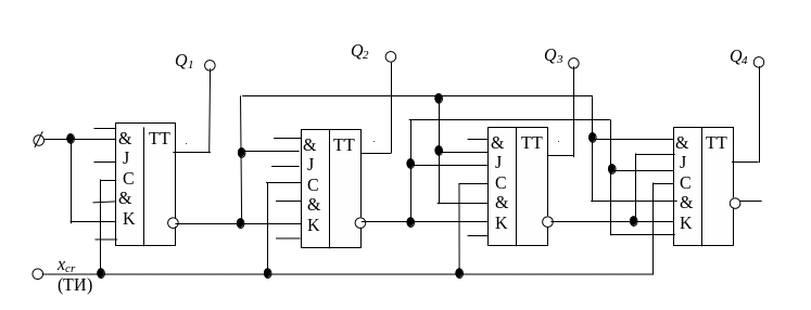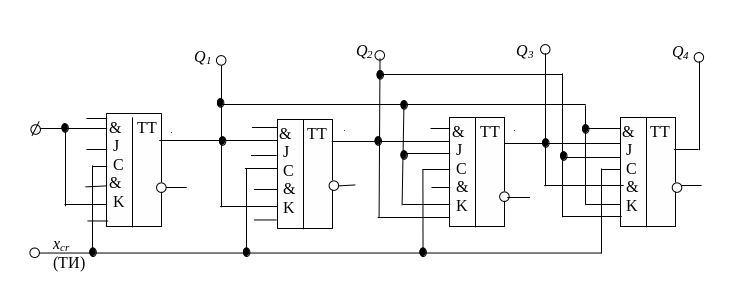 Счетный триггер является простейшим счетчиком, осуществляющим подсчет импульсов по модулю 2. Соединив несколько счетных триггеров определенным образом, можно получить схему многоразрядного счетчика.