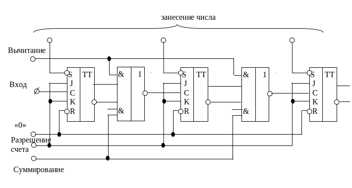 Обычно счетчик имеет цепь установки в 0, однако начальное его состояние не обязательно нулевое. Начальное состояние может устанавливаться передачей в счетчик коданекоторого числа и с него уже будет начинатьсяоперация счета единиц. Такой режим характерен, например, при образовании последовательности адресов команд при заданном исходном адресе.
