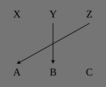 Пример 5.3. На предприятии имеется три машины A, B, C. Машина С находится в ремонте. В штате имеется три шофера X, Y, Z, из которых шофер X находится в отпуске. Распределение шоферов по машинам является примером соответствия. Пусть M является областью отправления, а N – областью прибытия соответствия Г = <G, M, N>.