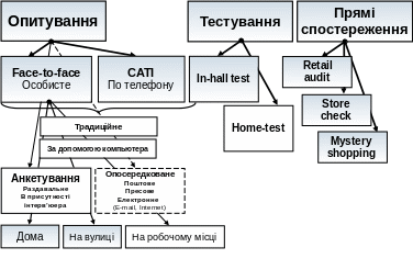 Якісні дослідження включать фокус-групи та проективні методики (метод асоціацій, метод завершення ситуації, експресивні методи).