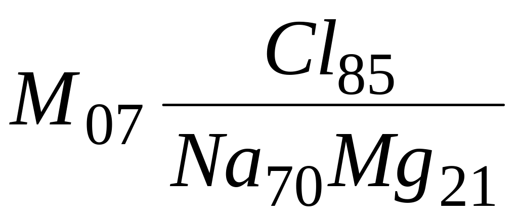 Химический состав Н2О очень часто изображают в виде формулы, которая предложена М. Г. Курловым. Это псевдо дробь, в числителе которой в убывающем порядке расположены анионы с индексом, равным содержанию данного иона в процент-эквивалентах, а в знаменателе в таком же порядке катионы. При этом ионы с содержанием менее 10 эквивалент-процента в формулу не включают. Слева перед дробью указывают минерализацию воды – М (в г/л с точностью до первого десятичного знака). Справа после дроби записывают температуру воды, реакцию воды рН, дебит скважины или расход источника (м3/ сут.). Вода, состав которой изображён ниже, называется хлоридно-натриевой, пресной (так как М 1 г/л).
