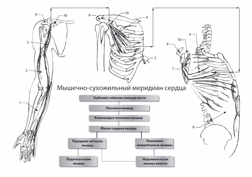 Далее мышечная цепь меридиана сердца распространяется на переднюю и боковую поверхность грудной клетки по малой грудной мышце, контактирующей с межреберной мускулатурой, передней зубчатой и подлопаточной мышцами.
