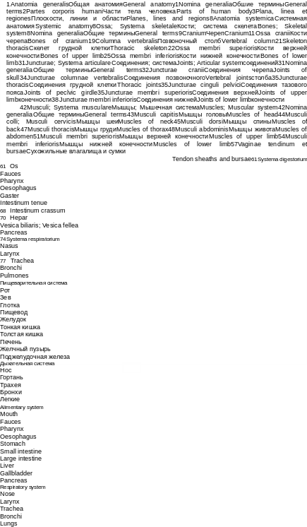 В настоящем издании приведен подробный новейший список анатомических терминов на латинском, русском и английском языках, расположенных соответственно по системам организма и органам.