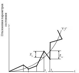 Z(t) – случайная величина в момент t, принимающая как положительное, так и отрицательное значения, характеризующая разность фактического отклонения параметра от плавной кривой VCtα под влиянием эксплуатационных факторов.
