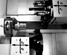 Рис. 5. Схемы расположения координатных осей и наладок токарно-фрезерных станков с ЧПУ: а – с поворотной шпиндельной головкой и противошпинделем; б – с двумя револьверными головками для осевого (сверху) и радиального (снизу) инструмента