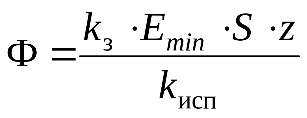 где kз – коэффициент запаса, учитывающий старение ламп и запыление колпаков светильников. Для ламп накаливания kз = 1,3 1,7, для газоразрядных ламп kз = 1,5 2,0. Для подземных выработок значение kз также нормируется (табл. П.2.2); Emin – минимальная освещенность по нормам, лк (табл. П.2.5); S – площадь освещаемого помещения, м2; z – коэффициент неравномерности освещения. Для рудничных светильников z – 1,3 1,4; kисп – коэффициент использования осветительной установки (табличная величина, зависит от типа светильника, коэффициента отражения стен и потолка и показателя помещения);