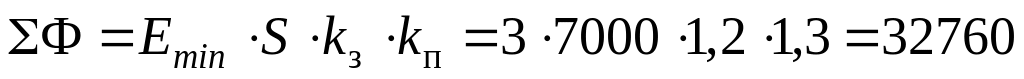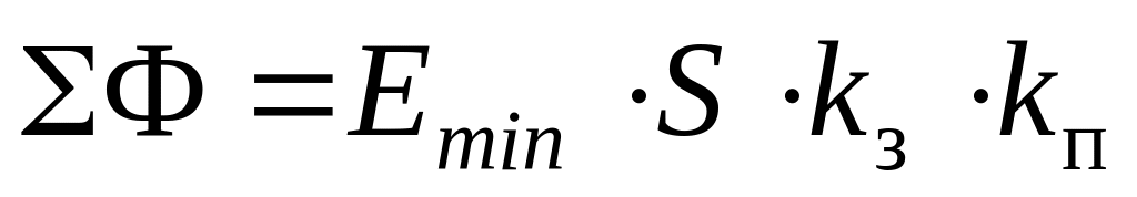 где Emin – требуемая освещенность для отдельных участков, лк; S – площадь отдельных освещаемых участков, м2; kз = 1,2 1,5 – коэффициент запаса; kп = 1,15 1,5 – коэффициент, учитывающий потери света в зависимости от конфигурации освещаемых площадей.