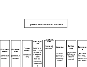 К основным приемам классического ручного массажа относятся следующие приемы: 1) поглаживание, 2) выжимание, 3) разминание, 4) растирание, 5) сотрясающие, 6) ударные приемы, 7) вибрация, 8) движения.