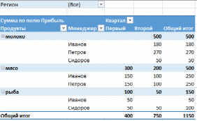 Область строк: поля Продукция и Менеджер. Обратите внимание на порядок – поле Менеджер должно быть вложенным в поле Продукция.