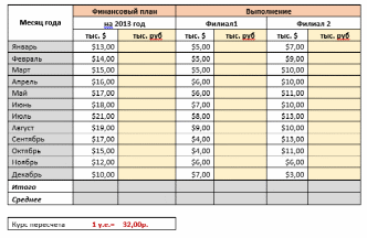 В таблице хранятся о сведения о выполнении финансового плана фирмой и ее филиалами по месяцам. Необходимо оформить рабочий лист по образцу и заполнить недостающие поля: