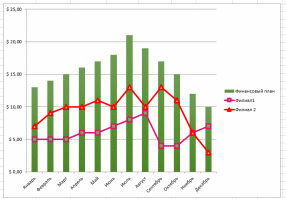Для того, чтобы на одной диаграмме отобразить графики разных типов – столбчатой диаграммы финансового плана и двух графиков его фактического выполнения следует изменить тип выделенного элемента диаграммы.