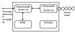 Все модемы содержат в себе управляющий микропроцессор, постоянную память (ROM), куда записано фирменное программное обеспечение и интерпретатор команд, энергонезависимую память (NVRAM – non-volatile (энергонезависимую) RAM), которая хранит информацию о конфигурациях модема, телефонные номера и т.д., буфер ввода/вывода (128-256 байт), сигнальный процессор (DSP), включающий в себя модулятор и демодулятор, интерфейс для связи с ЭВМ (RS-232) и оперативную память.