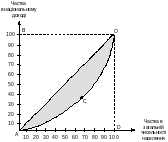 а) ступінь нерівності у розподіленні доходів – крива Лоренца (Lorenz curve) показує фактичне розподілення доходів. Якби між усіма членами суспільства існував абсолютно рівний розподіл доходів, то такий розподіл відображала би бісектриса ОА. Насправді ж, ступінь нерівності показує заштрихована ділянка ОСА між бісектрисою та кривою Лоренца. Що далі крива від бісектриси, то більшою є нерівність (рис.10.1);