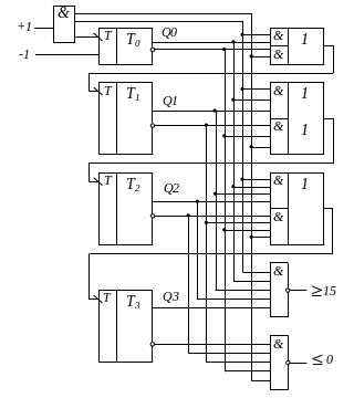 Функциональная схема реверсивного счетчика с раздельными входами сложения - вычитания представлена на рис. 4.49. В этом случае состояние счетчика увеличивается на 1 с каждым импульсом, поступающим на вход «+1», и уменьшается на 1 с каждым импульсом, поступающим на вход «–1». При выполнении условий переключения импульс с входов «+1» или «–1» поступает на вход Т-триггера и вызывает его переключение. Импульсы должны быть короткими и нулевыми.