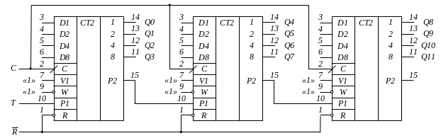 При разработке схем следует учитывать, что максимальное время переключения синхронного счетчика определяется временем переключения одной ИС (если Q0 = Q1 = Q2 = Q3 = Q4 = Q5 = Q6 = Q7 = 1 все три ИС начинают переключаться одновременно), а в асинхронном счетчике суммой времен переключения ИС. Максимальное время переключения 12-разрядного счетчика в три раза больше времени переключения 4-разрядного.