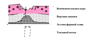 Рифты закладываются на участках континентальной коры, отличающихся пониженной мощностью, обусловленной подъемом астеносферы в виде мантийных? диапиров. Анализ результатов геофизических исследований глубинного строения рифтовых зон показывает, что под ними существуют восходящие потоки мантийного вещества (Хаин, Ломизе, 1995), чем и обусловливается сам процесс рифтогенеза и активный магматизм рифтов.