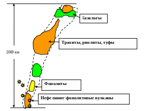 Магматизм горячих точек: субщелочной бимодальный (трахибазальты, базальты, трахириолиты). Это указывает на существование двух источников магматизма: