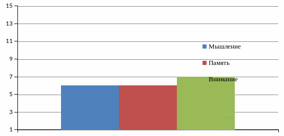 При обработке данных, полученных в результате эксперимента, нами была выстроена следующая гистограмма. На которой, наглядно представлено, что мышление и память ребенка находятся на уровне ниже среднего, в отличие от уровня внимания, которое по результатам трех выполненных исследуемым заданий располагается на ступень выше.