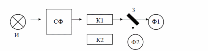 Источник света создает излучение в широком диапазоне длин волн, светофильтр выделяет из него нужный участок спектра. Этот свет далее проходит либо через кювету (К2), в которую помещают исследуемый раствор, либо через кювету сравнения (К1), в которой находится растворитель. Пучок света, прошедший через кювету, расщепляется полупрозрачным зеркалом на два пучка, интенсивности которых регистрируются фотоприемниками Ф1 и Ф2. Два фотоприемника используются для измерений в разных участках спектра.