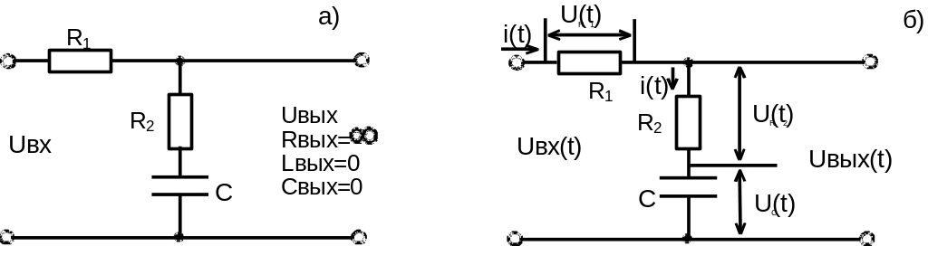 Рис. 1.1.1. Принципиальная схема (а) и схема распределения токов и падений напряжений на элементах апериодического звена (б)