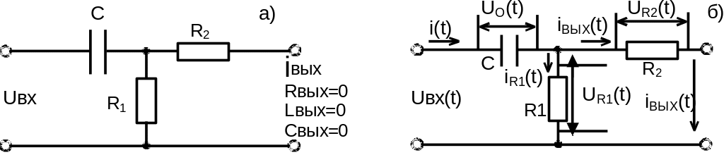 Рис. 1.2.1. Принципиальная схема (а) и схема распределения токов и падений напряжений на элементах дифференцирующего звена (б)