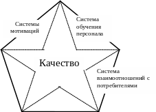 Для графической иллюстрации основных этапов развития систем качества используются фигура, хорошо известная в российском производстве – "Знак качества". Контур этой фигуры, который, как известно, называется "Пентагон", заполним пятиконечной звездой и то, что получилось - “Звезда качества" (рис. 1).