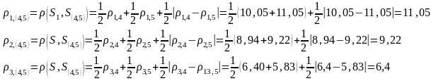 Расстояние между кластерами будем находить по принципу “ближайшего соседа”, воспользовавшись формулой пересчета. Так расстояние между кластером S1 и кластером S(4,5) равно: