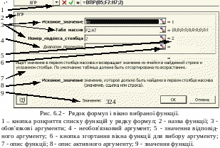 У діалозі Майстер функцій під списками знаходиться рядок опису синтаксису і дається коментар про призначення виділеної функції. У рядку синтаксису аргументи, виділені напівжирним шрифтом, є обов'язковими. Якщо обов'язкові для функції аргументи не будуть зазначені, то її неможливо буде ввести в комірку. Коли виділити функцію в списку, автоматично з'являються назви аргументів функції з указівкою правильного розташування дужок, ком і крапок з комами в рядку формул.
