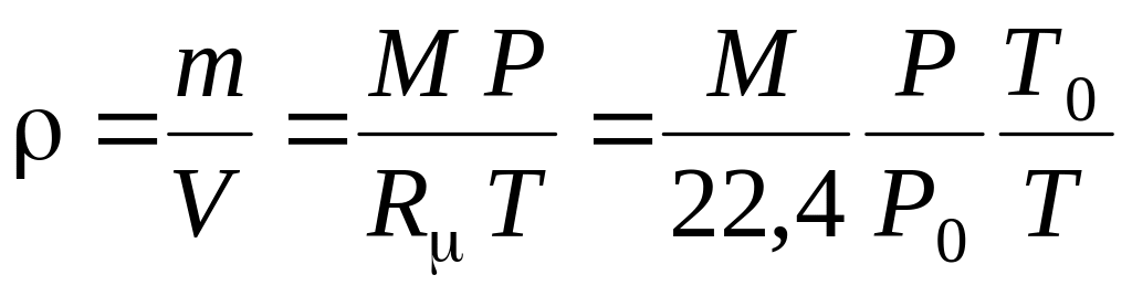 где М – мольная масса газа, кг/кмоль; R = 8314 Дж/(кмольК) – универсальная газовая постоянная; Р – давление абсолютное, Па; Р0 =101325 Па (760 мм рт. ст.) – нормальное давление; Т – абсолютная температура, К; Т0 = 273,15 К – нормальная температура; 22,4 – мольный объем идеального газа при нормальных условиях, м3/кмоль.