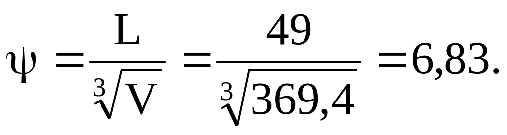 V = L ∙ B ∙ T ∙ = 49,0 ∙ 7,3 ∙ 1,35 ∙ 0,765 = 369,4 м3.