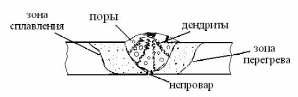 2 Разрушающие методы контроля, когда из сварного шва вырезают образец, подго-тавливают из него макрошлиф. Травление проводят 10% водным раствором азотной кис-лоты. В этом случае можно выявить зону перегрева, зону сплавления, поры, трещины, дендритное строение сварного шве (рисунок 3.5).